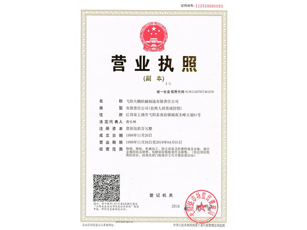 • 09-28弋陽大鵬機械制造有限責任公司成功取得規(guī)范